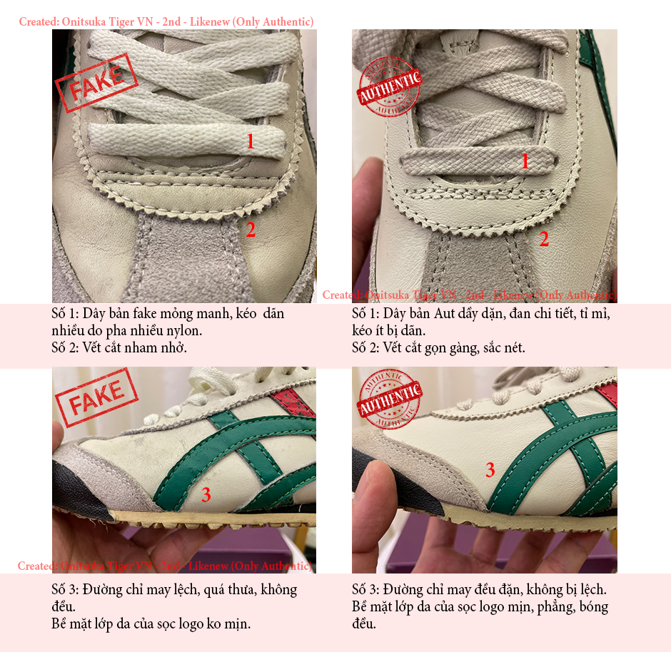 Chất liệu da: Giày Onitsuka Tiger chính hãng sử dụng da thật cao cấp, bề mặt mịn màng và đồng đều. Trong khi đó, giày giả thường sử dụng da tổng hợp kém chất lượng, bề mặt thô ráp và dễ bị hư hỏng.